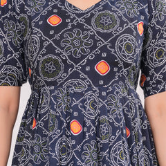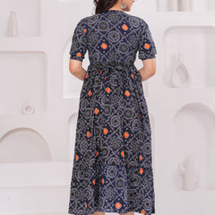 The rich Black base is beautifully adorned with intricate traditional ethnic motifs in white, olive green, and accents of orange for a vibrant yet graceful appeal. The V-neckline and short sleeves add a contemporary touch, while the gathered empire waist offers a roomy and flowy fit. The flared hem gives it a breezy, feminine flair—perfect for casual wear, festive gatherings, or even baby showers.