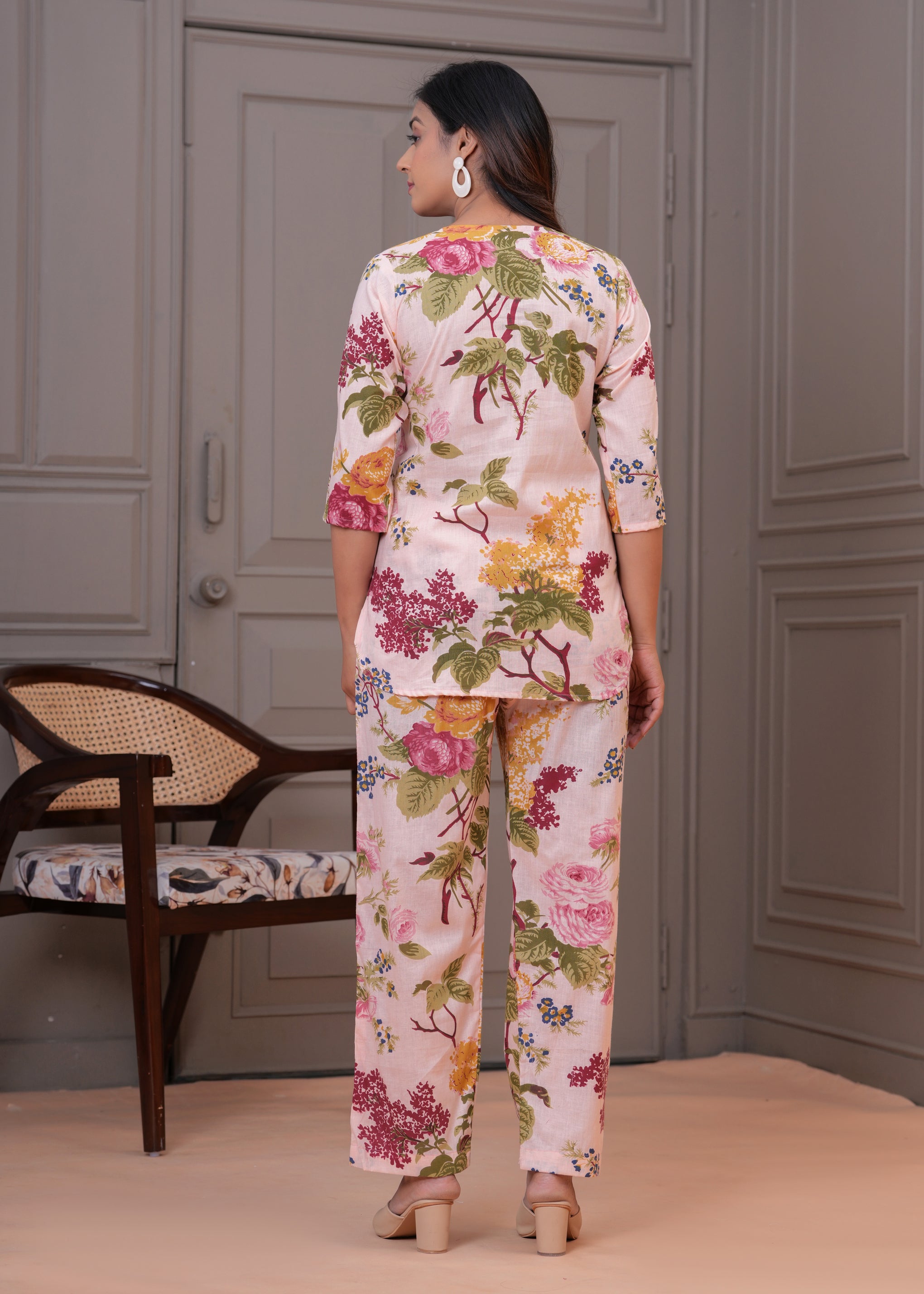 Step into effortless style with this stunning two-piece co-ord set, designed in a soft blush pink tone and adorned with vibrant multicolored floral prints. Crafted from breathable fabric, the outfit features a 3/4 sleeve tunic-style top paired with relaxed-fit trousers, offering both comfort and sophistication. Perfect for casual brunches, resort getaways, or laid-back festive gatherings, this ensemble blends tradition with contemporary flair. Complete the look with neutral heels and statement earrings for an effortlessly chic appearance.