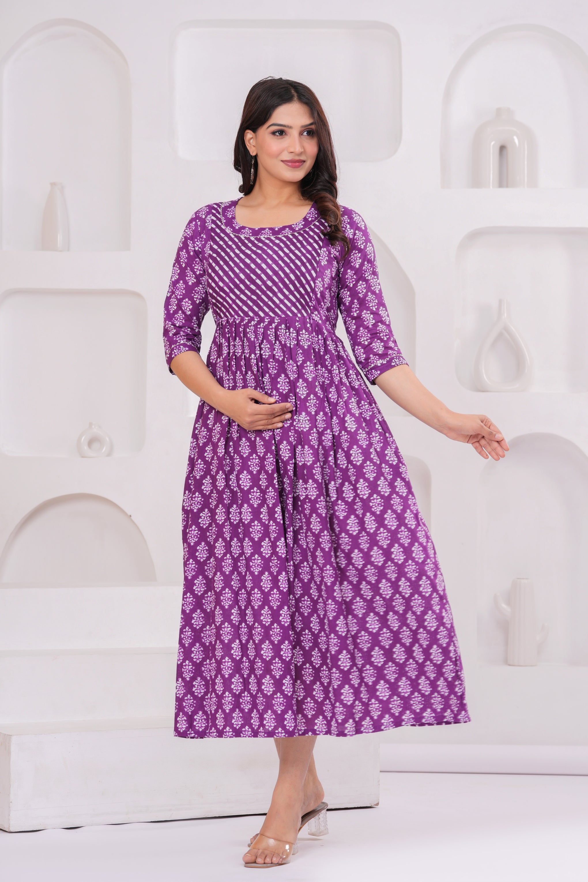 Step into effortless elegance with this stunning purple Anarkali Maternity kurta, crafted from breathable cotton fabric for all-day comfort. The kurta features a flattering fit-and-flare silhouette with a beautifully coordinated mix of diagonal stripes on the yoke and classic white floral motifs throughout. Designed with 3/4th sleeves and a scoop neckline, it's perfect for both casual outings and festive gatherings. Pair it with leggings, palazzos, or wear it as a dress — a versatile must-have for your ethnic wardrobe.