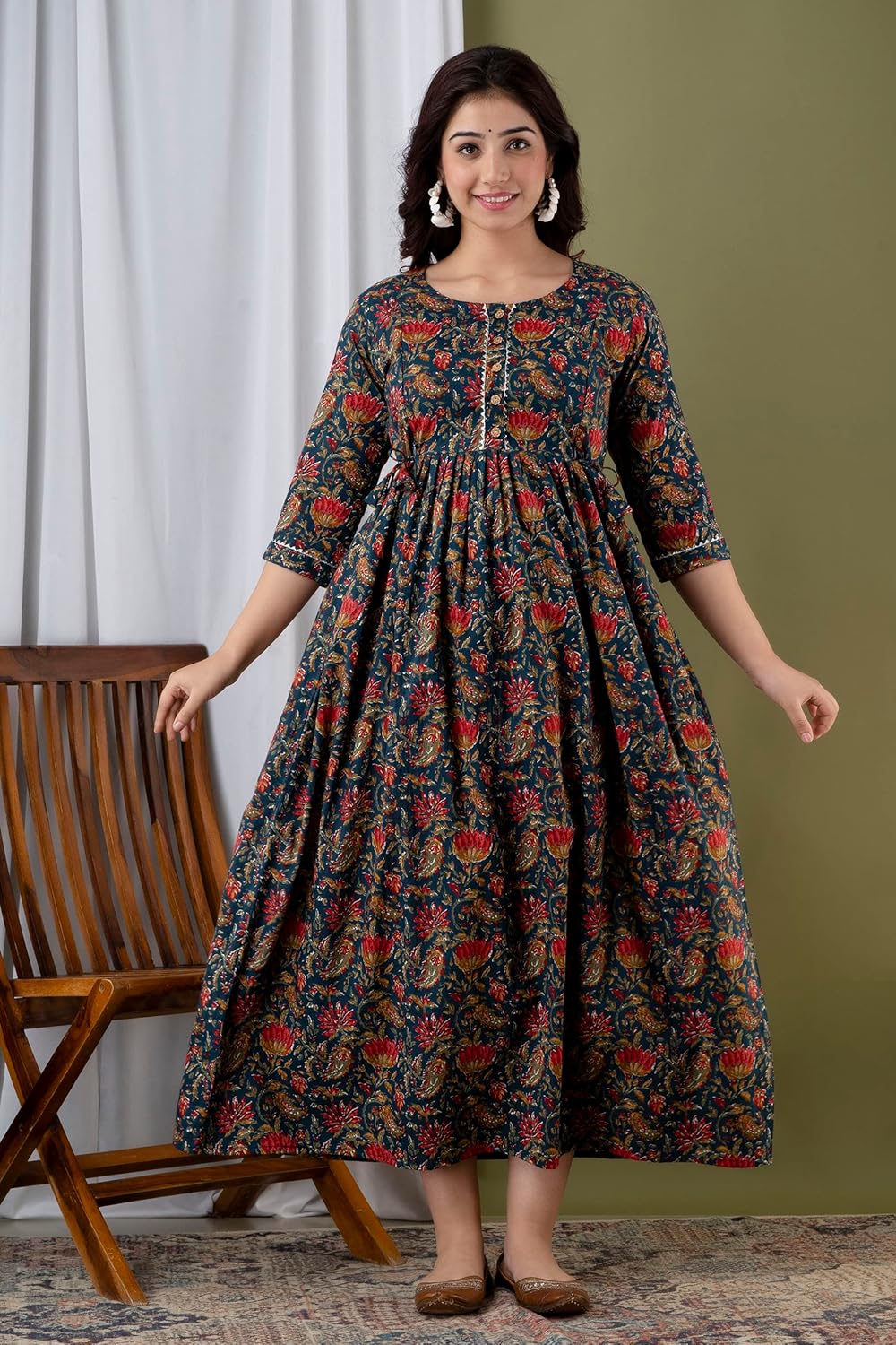 Nevy Blue - Maternity Feeding Kurti with Zipper | Cotton Floral Printed Pregnancy & Nursing Dress | Comfortable & Stylish Maternity Wear for Women | Breastfeeding Kurta with Zipper | Soft & Elegant