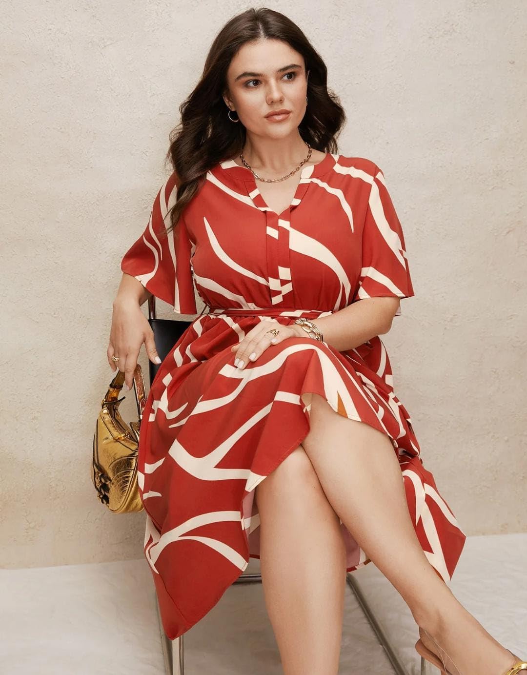 Red - One Piece Dress for Women, New American Print Rayon Midi Dress, Stylish, Modern Party Outfit, Perfect for Casual and Formal Occasions