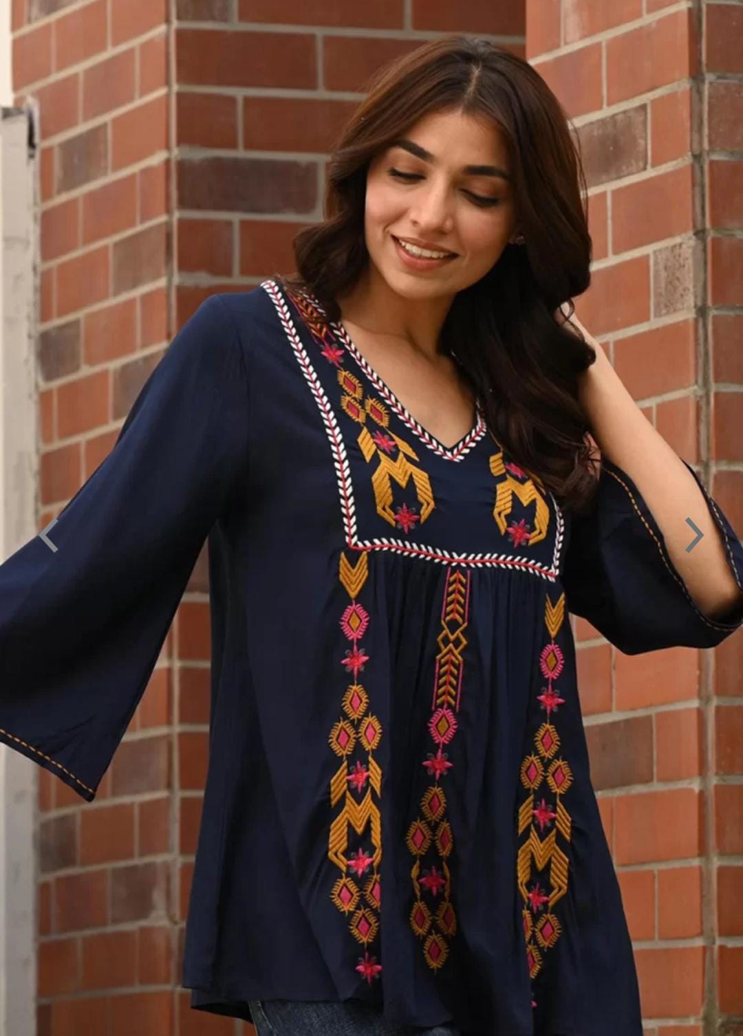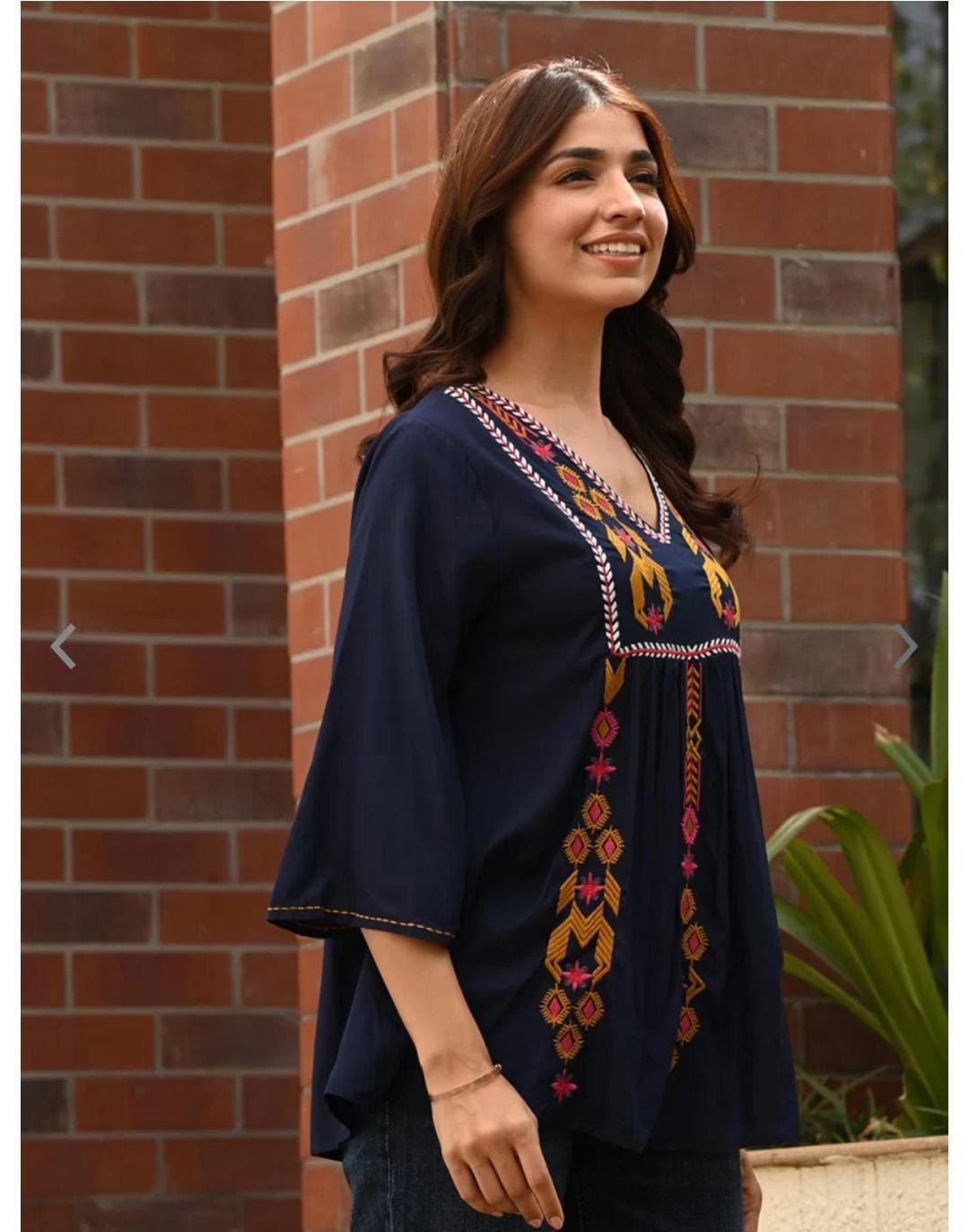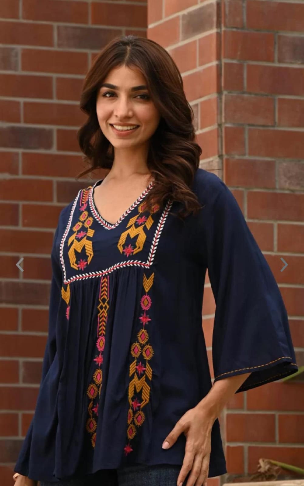 This blue rayon embroidered top is crafted for everyday ease with a polished finish. The soft rayon fabric offers a smooth, breathable feel, while the V-shaped neckline adds a flattering silhouette. Finished with delicate embroidery, it brings quiet elegance to a simple, comfortable design.