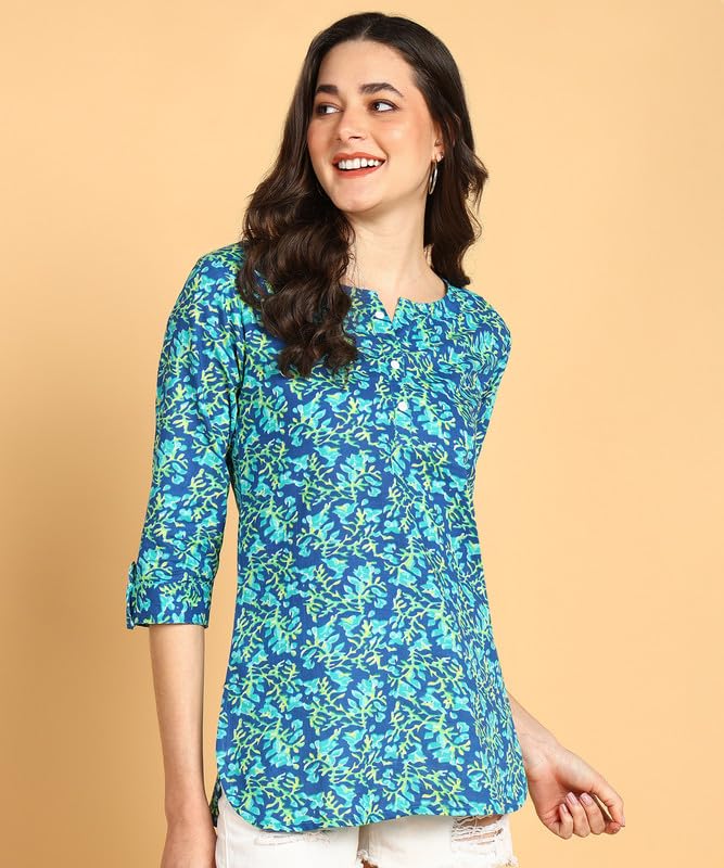 Sky Blue1 - Women's Floral Printed Cotton Top - Stylish Long Top with Mandarin Collar, Perfect for Jeans, Ideal for Casual & Ethnic Wear
