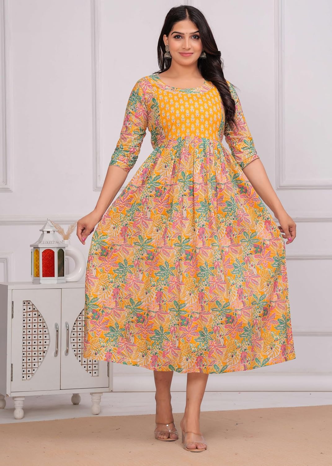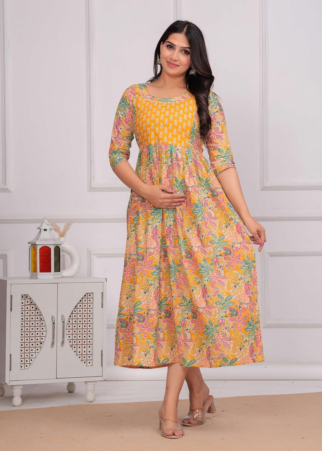 Yellow Green Floral - JAIPURFAME Maternity Feeding Kurti with Zipper | Cotton Floral Printed Pregnancy & Nursing Dress | Comfortable & Stylish Maternity Wear for Women | Breastfeeding Kurta with Zipper | Soft & Elegant