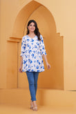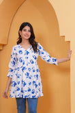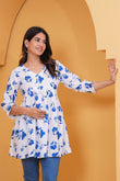 Elegant White & Blue Floral Printed A-Line Tunic Top for Women
