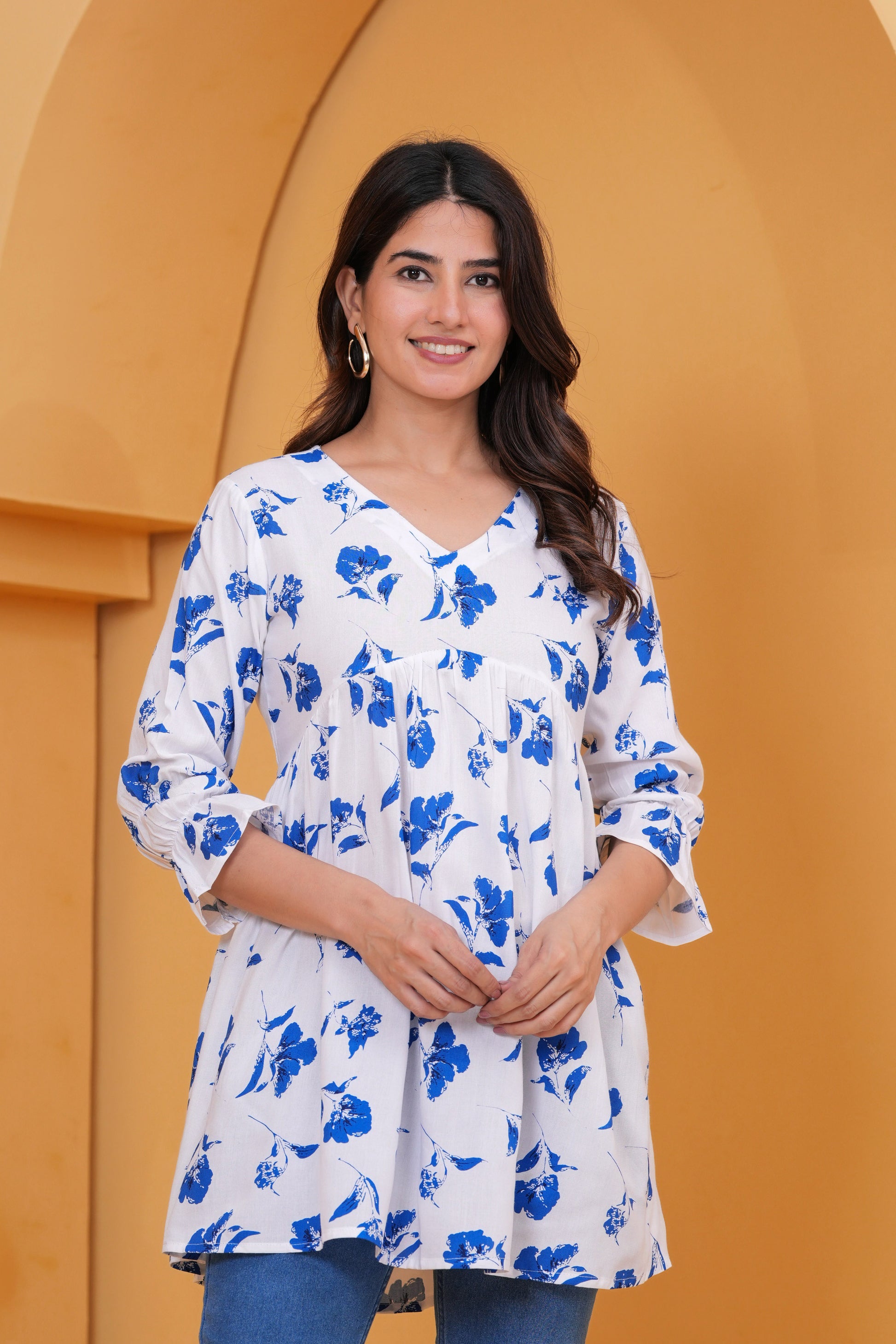 Add a refreshing touch to your everyday wardrobe with this beautiful white A-line tunic top, adorned with vibrant blue floral prints. Crafted from lightweight and breathable fabric, it features a flattering V-neckline, 3/4th sleeves with gathered cuffs, and a comfortable flared silhouette that suits all body types. Perfect for casual outings, brunches, or relaxed office wear, this top pairs effortlessly with jeans, leggings, or trousers for a chic, effortless look. Embrace elegance and comfort with every wear.