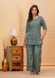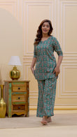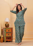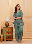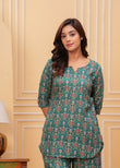 Short Description Slip into effortless style with this emerald green co-ord set, featuring a soft 3/4-sleeve top and relaxed wide-leg pants. The all-over floral tile motif adds a chic boho touch, while the easy silhouette keeps you comfy from lounging to casual outings.