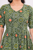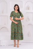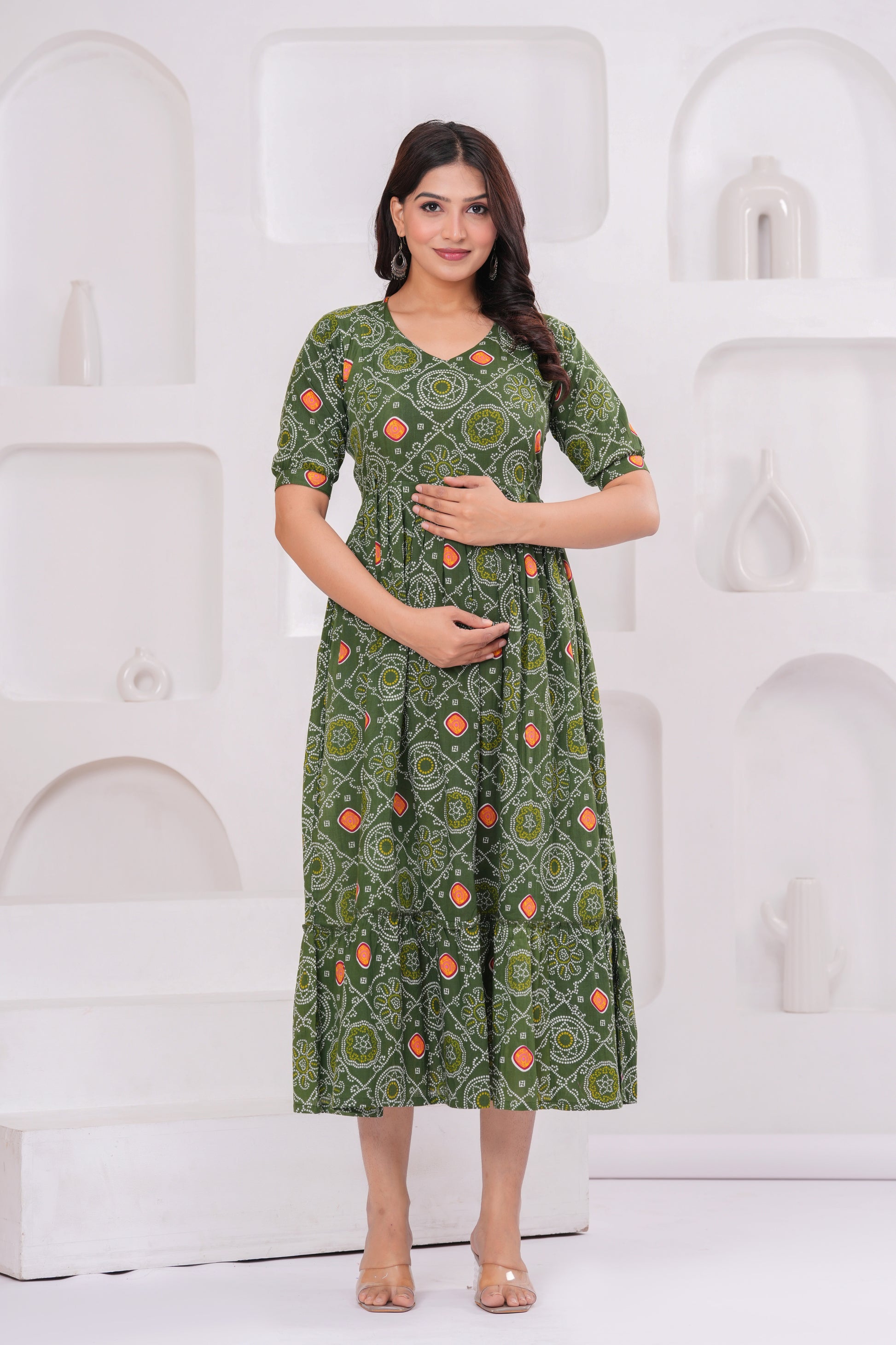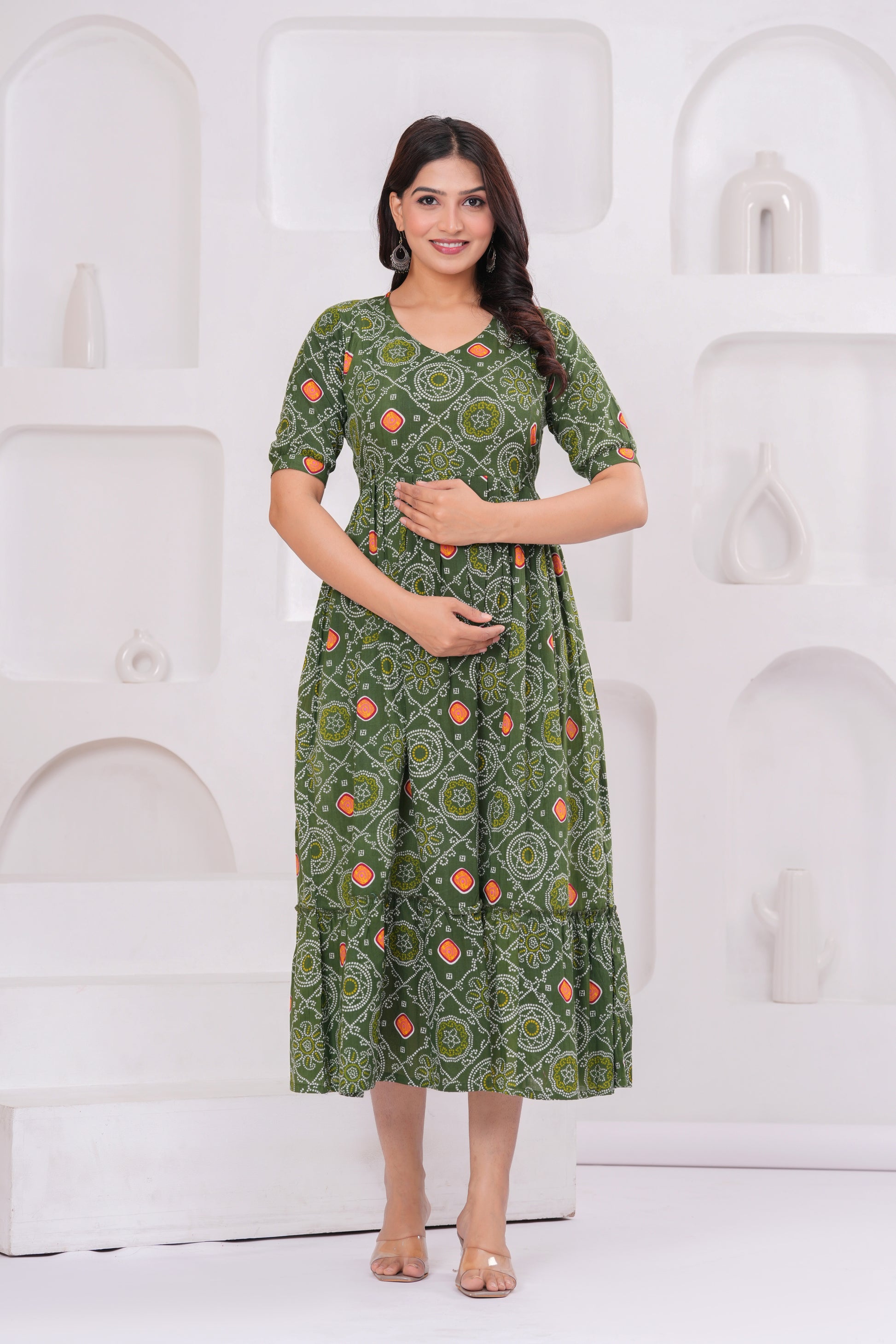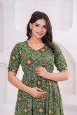 Embrace effortless elegance and comfort with this beautiful olive green Maternity Anarkali Kurta. Crafted in soft, breathable cotton, this midi-length kurta features an all-over traditional block print with vibrant orange highlights, adding a pop of color to its earthy charm.