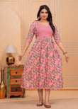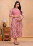 Step into effortless elegance with this charming pink floral maternity and nursing dress. Designed with soft cotton fabric, it ensures comfort throughout pregnancy and beyond. The dress features a stylish printed yoke, three-quarter sleeves, and a beautifully flared silhouette that flatters every stage of motherhood. Hidden zippers on both sides provide convenient nursing access, making it a perfect blend of fashion and functionality. Pair it with your favorite flats or juttis for a graceful everyday look.