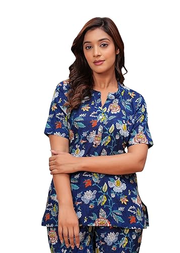 Women's Blue Floral Cotton Co-Ord Set - Soft & Comfortable Loungewear with Stylish Top and Pants - Casual and Everyday Home Wear for Women and Girls